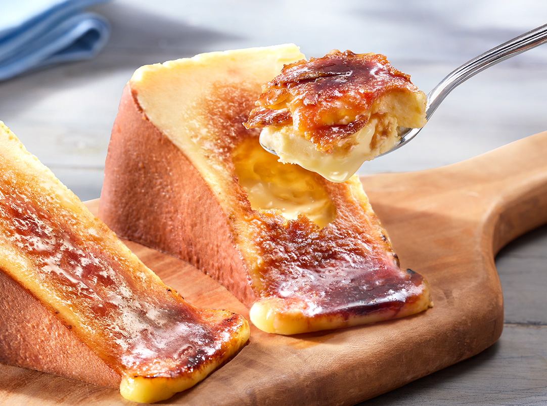 酪農大陸オーストラリアのクリームチーズ仕立て。コク深いベイクドチーズに爽やかなレアチーズを重ねて、直火でパリッと香ばしくブリュレしました。焦がされた熱々チーズがとろとろっととろけおちた、グルメなダブルチーズケーキです。