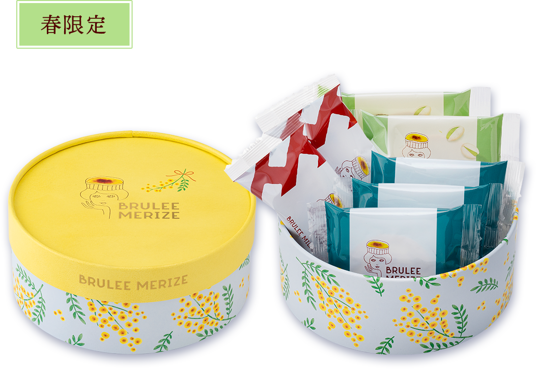 3種類のブリュレスイーツをお楽しみいただけるお詰合せが、暖かな春の訪れを告げるミモザ柄で新登場。心がぱっと明るくなるような黄色のパッケージはプレゼントにも。